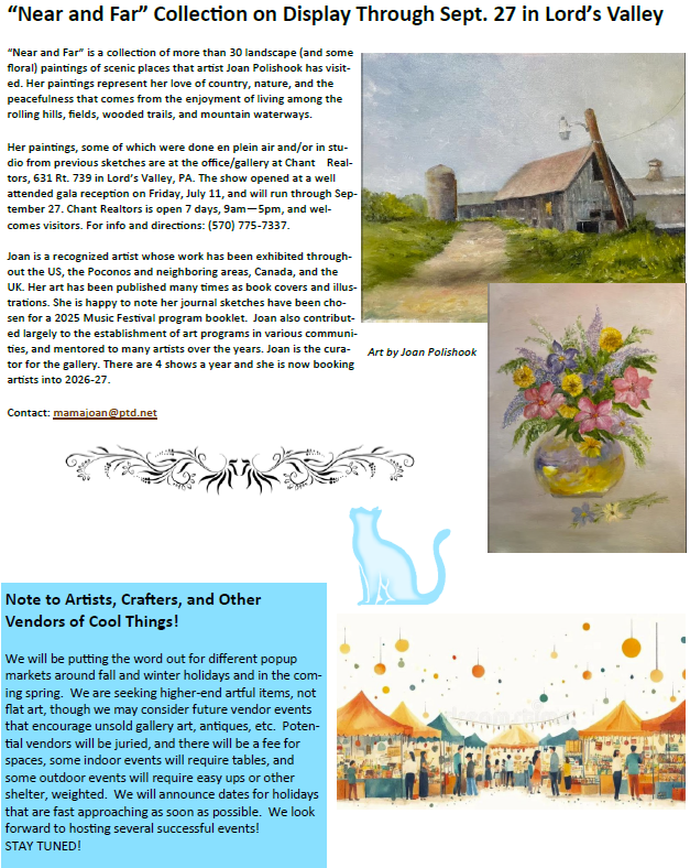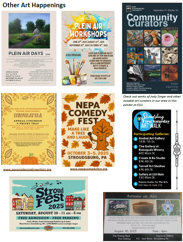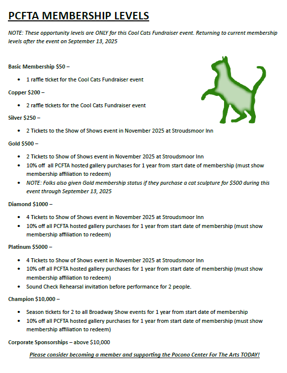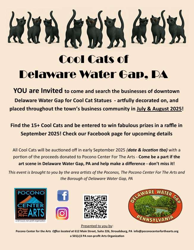 My personal favorite project, if I must choose, has been Cool Cats of Delaware Water Gap. The online auction is about to begin, with the countdown the our Saturday, September 13th 2025 event, which will allow artists, patrons, cat fans, and the curious, to gather at Sycamore Grill in DWG to have a lovely afternoon pre-fixed afternoon buffet luncheon from 2 – 4pm, meet new friends, take a chance on some really nice raffle gifts from the practical to pampering, and of course, see all 15+ cat statues on display in Sycamore Grill’s Event Room. Anyone can bid on the cats online, (The opening of the online auction and Fundraiser details will be announced very soon!) but those present can have the advantage to see details of the artists’ handiwork, place final bids, & be part of the festivities! Stay tuned for ticket info!